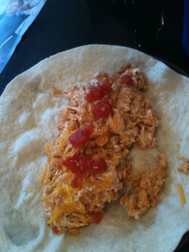 Heat a frying pan on medium, spray with oil, add a can of shredded chicken, a half can of corn, a can of rotel diced tomatoes (with chilies if you're into that), microwavable Spanish or Mexican rice, sour cream or cream cheese, and mix until combined. Spoon into soft tortillas, sprinkle on cheese and serve! You can add any extras you have around like jalapenos, black beans, salsa, hot sauce etc.