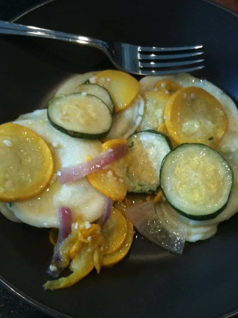 Boil precooked frozen cheese ravioli. While ravioli is cooking, heat oil spray in a frying pan on medium heat. Quickly slice up zucchini and summer squash, add olive oil and the vegetables, add a bit of frozen chopped onion. Drain the ravioli, mix with vegetables and oil and serve.