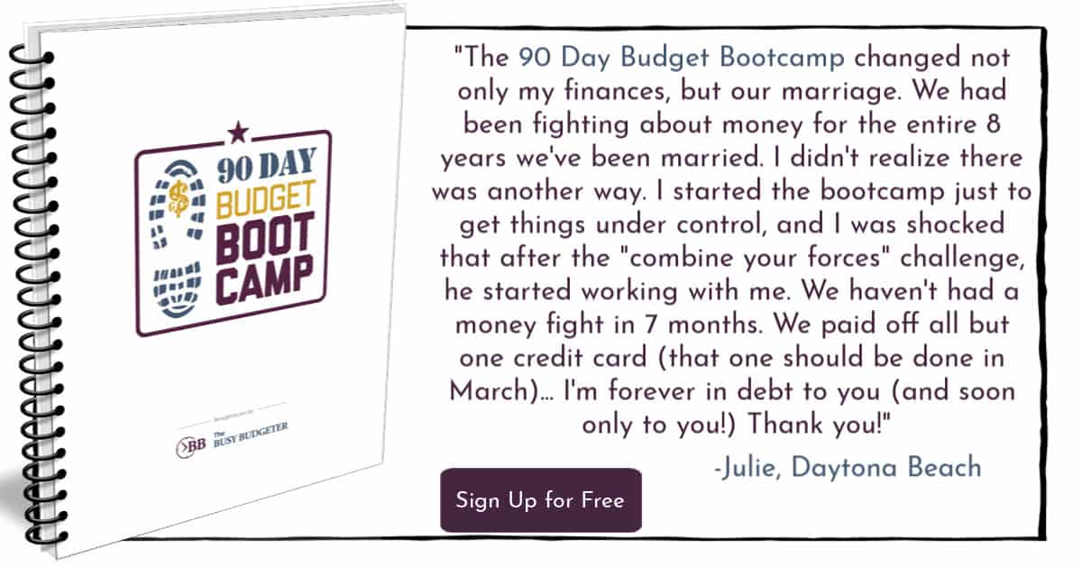 P.S. Want to eat better and save a TON of money? The 90 Day Budget Boot Camp is free for a limited time! You can enroll here to get access to the step by step challenges that have changed the lives of over 65,000 people and counting! (Maybe you’re 65,001?) Click here to get the 90 Day Budget Boot Camp for free!